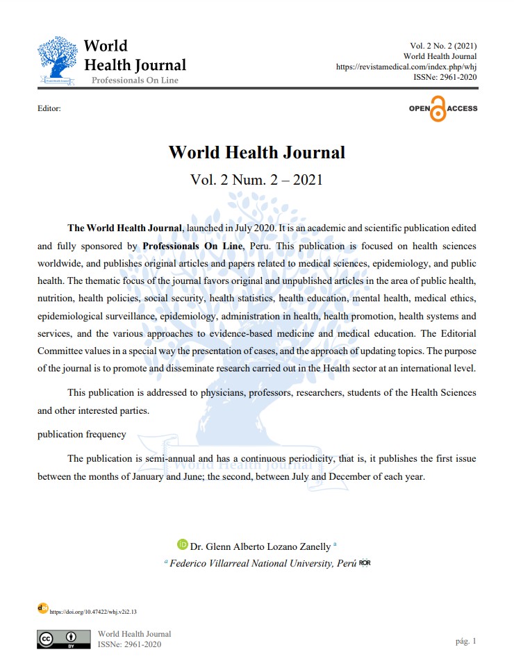 The World Health Journal, launched in June 2020. It is an academic and scientific publication edited and fully sponsored by Professionals On Line, Peru. This publication is focused on health sciences worldwide, and publishes original articles and papers related to medical sciences, epidemiology, and public health. The thematic focus of the journal favors original and unpublished articles in the area of public health, nutrition, health policies, social security, health statistics, health education, mental health, medical ethics, epidemiological surveillance, epidemiology, administration in health, health promotion, health systems and services, and the various approaches to evidence-based medicine and medical education. The Editorial Committee values in a special way the presentation of cases, and the approach of updating topics. The purpose of the Journal is to promote and disseminate research carried out in the Health sector at an international level.