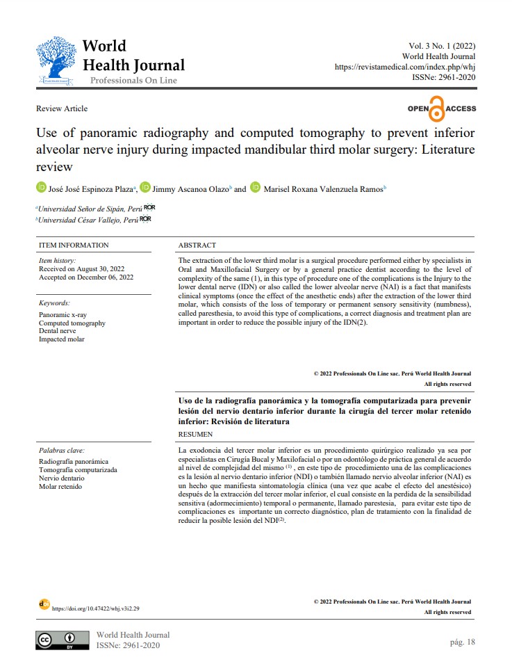 The extraction of the lower third molar is a surgical procedure performed either by specialists in Oral and Maxillofacial Surgery or by a general practice dentist according to the level of complexity of the same (1), in this type of procedure one of the complications is the Injury to the lower dental nerve (IDN) or also called the lower alveolar nerve (NAI) is a fact that manifests clinical symptoms (once the effect of the anesthetic ends) after the extraction of the lower third molar, which consists of the loss of temporary or permanent sensory sensitivity (numbness), called paresthesia, to avoid this type of complications, a correct diagnosis and treatment plan are important in order to reduce the possible injury of the IDN(2).