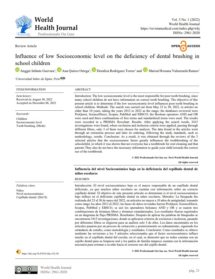 Introduction: The low socioeconomic level is the most responsible for poor tooth brushing, since many school children do not have information on correct tooth brushing. The objective of this present article is to determine if the low socioeconomic level influences poor tooth brushing in school children. Methods: The search was carried out from May 23 to 30, 2022, in articles no older than 10 years, taking the years 2012 to 2022 as the range; the databases reviewed were ProQuest, ScienceDirect, Scopus, PubMed and EBSCO, the Boolean operators AND and OR were used and three combinations of free terms and standardized terms were used. The results were recorded in a PRISMA flowchart. Results: After applying the search words, 3415 investigations were found, where exclusion and inclusion criteria were applied, passing through different filters, only 3 of them were chosen for analysis. The data found in the articles went through an extraction process and later its ordering, following the study standards, such as methodology, results. Conclusion: As a result, it was obtained through the reviews of the 3 selected articles that the socioeconomic factor greatly influences the toothbrushing of the schoolchild, in which it was shown that not everyone has a toothbrush for oral cleaning and that parents They also do not have the necessary information to guide your child towards the correct use of the toothbrush.